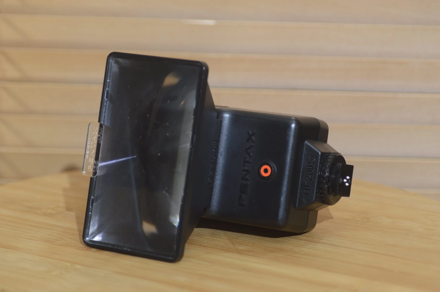 The Pentax AF 200S is a cordless, hotshoe-mounted electronic flash that offers TTL Auto, two-level Auto and four-level manual modes. The TTL mode can work on several Pentax 35mm SLR cameras such as the Pentax ME-Super, ME-F, MG, or LX, as well as Pentax medium format cameras and even some Pentax DSLR cameras
