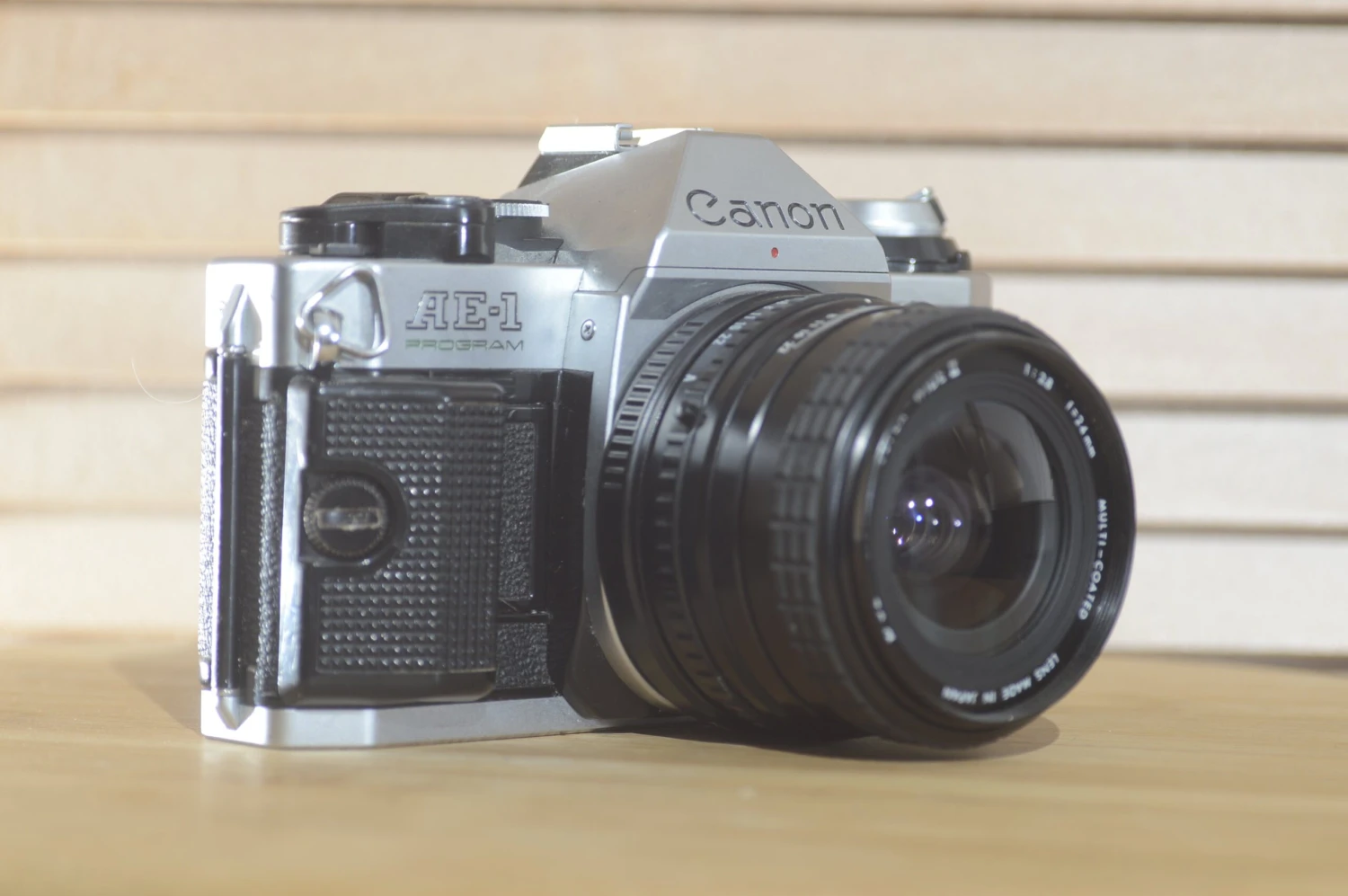 The Canon AE-1 Program is a 35 mm single-lens reflex camera that uses Canon’s FD mount lenses. It was introduced in 1981 as the successor to the Canon AE-1, five years after that camera’s introduction. The major difference was the addition of the Program AE mode first seen in the A-1. This mode sets both the shutter speed and aperture automatically—albeit with a slight bias towards the shutter speed setting. The user focuses the camera and then presses the shutter button. For those desiring more control, the AE-1’s shutter priority auto-exposure and full manual modes are still available