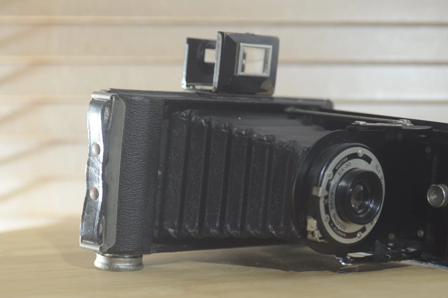 The first model is named on the faceplate Folding Brownie Six-20 and was made from 1937-1940. It has a fixed-focus Meniscus lens in a Kodette II shutter. A Brilliant finder was an optional extra from 1938.[1].