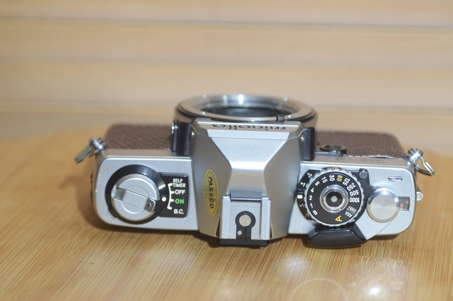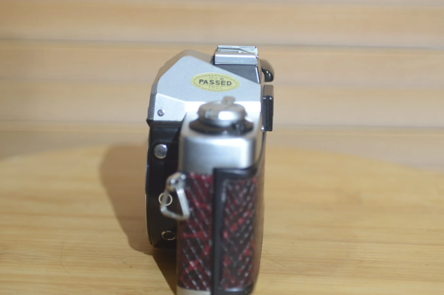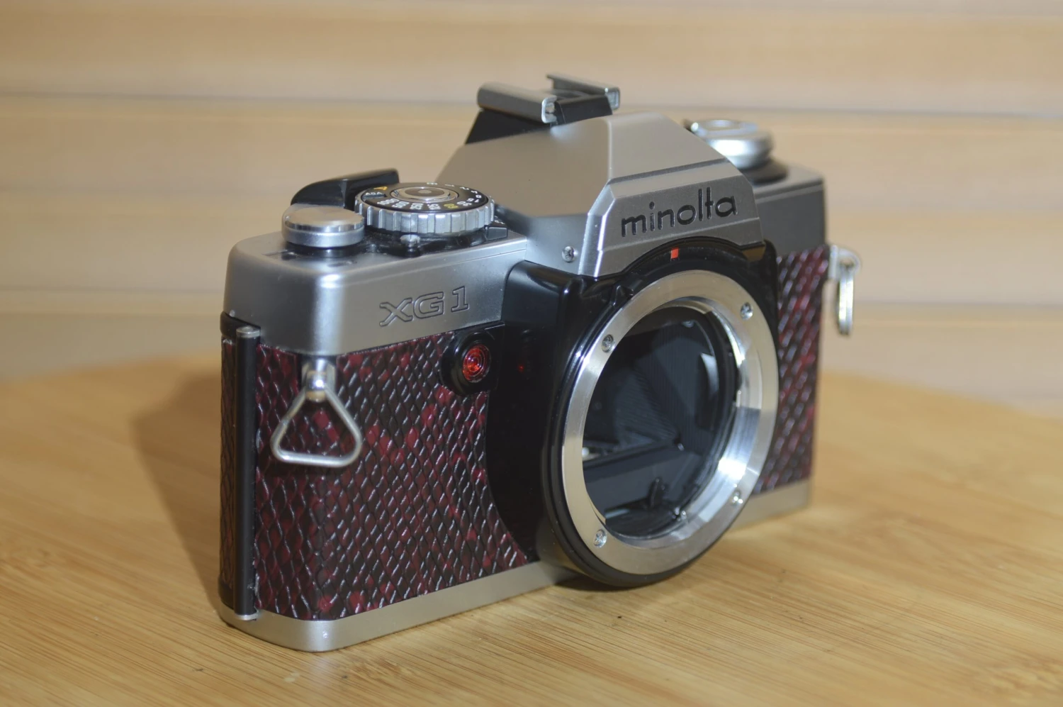 With custom dark red and black crocodile pattern leatherette. These are fantastic cameras with a distinctive style, this one especially. Pair it with a Minolta lens for a beautiful vintage 35mm film camera set up.