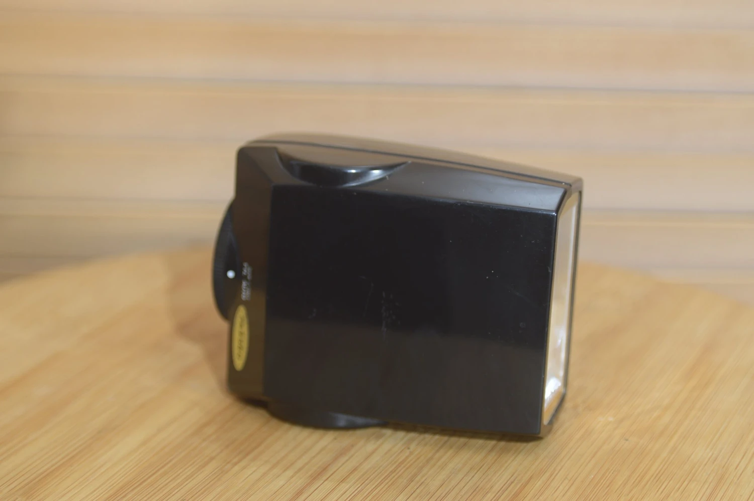 Fantastic bounce flash with a lot of control. Taking 4 x AA batteries. It has been cleaned and tested and is corrosion free.