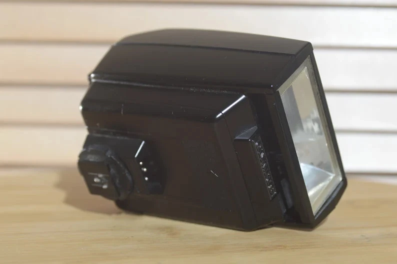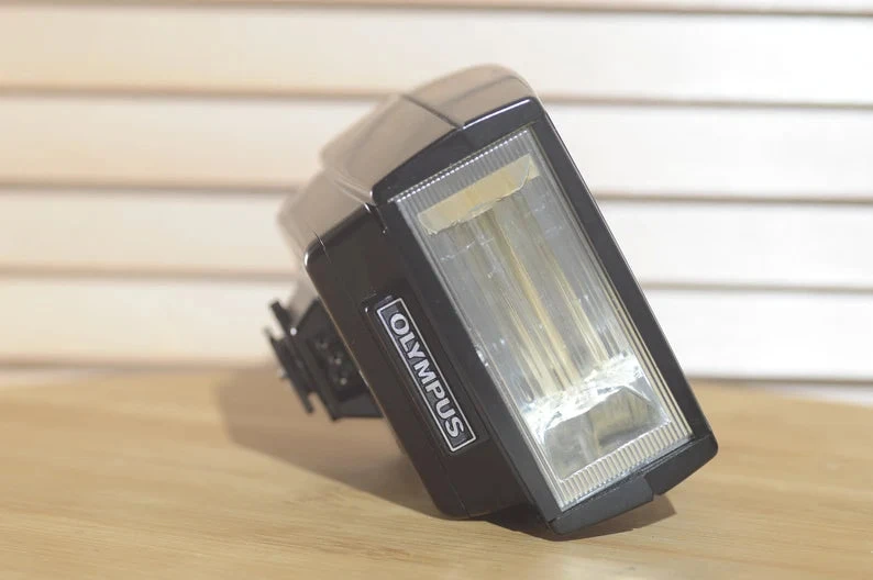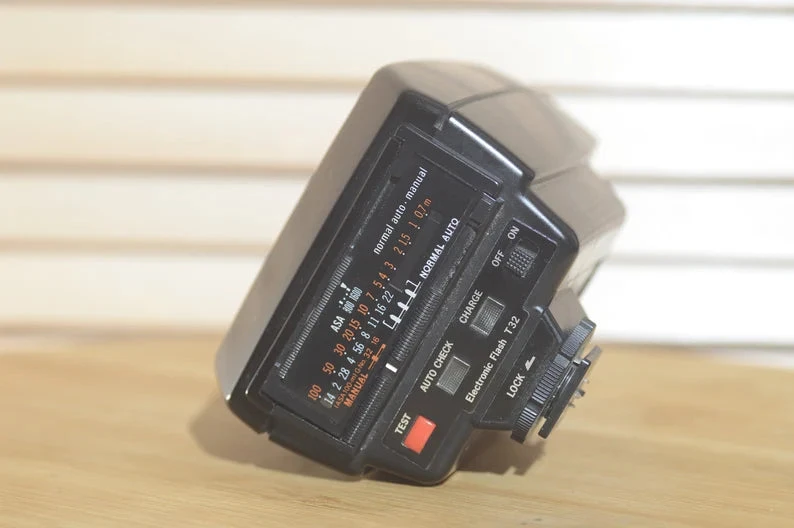 Olympus Electronic Flash T32 is a fully automatic, electronically controlled flash unit. It is a lovely bit of kit that takes four AA batteries. It has been cleaned and tested and is corrosion free. Happy clicking.