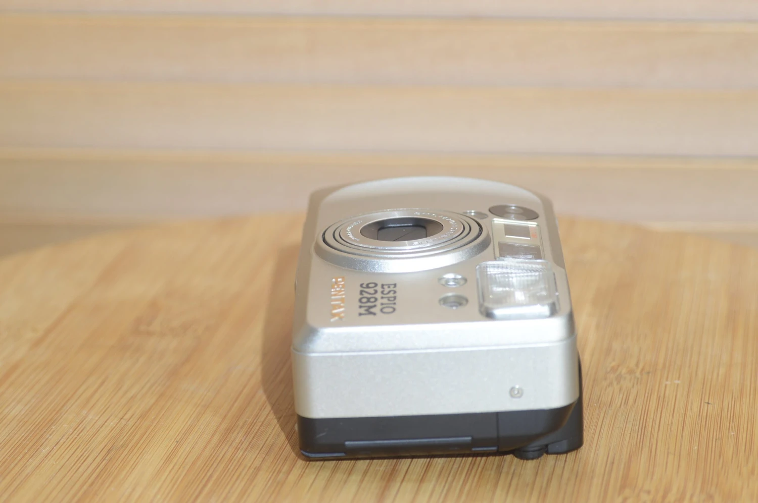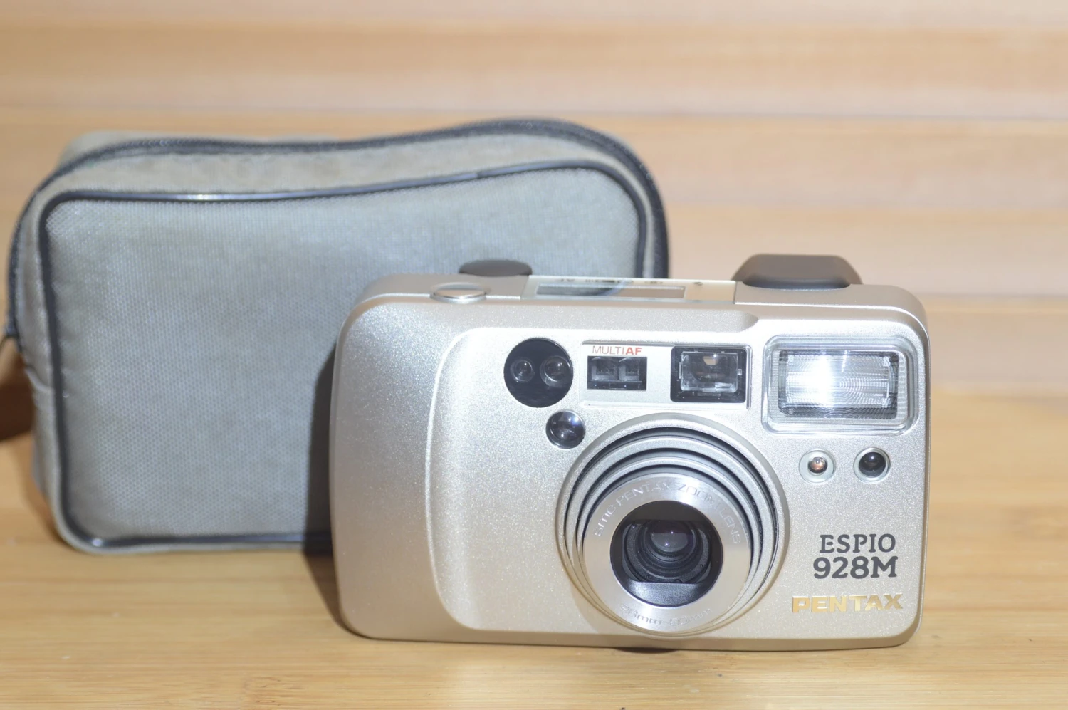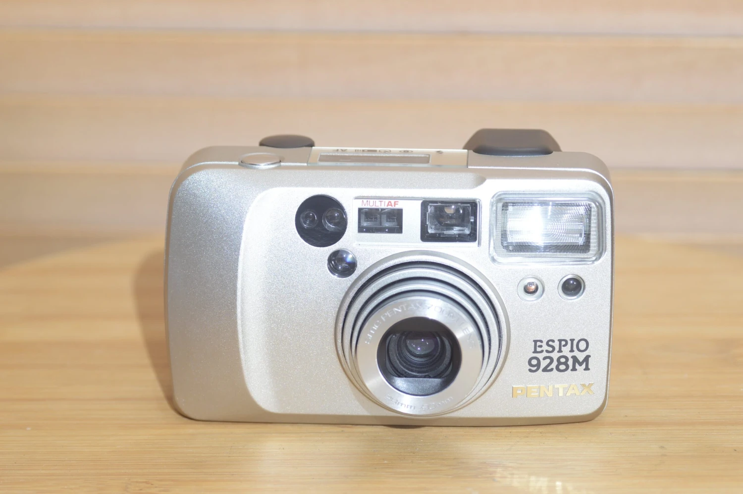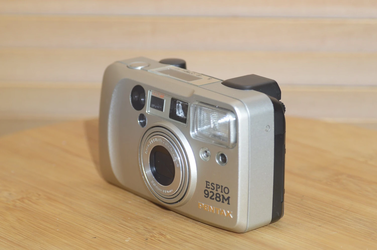 The Pentax Espio 928M is a 35mm compact film camera with a 28–90 mm zoom lens. It has a built-in flash, automatic film advance, and a self-timer.