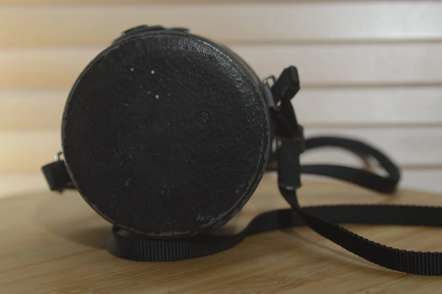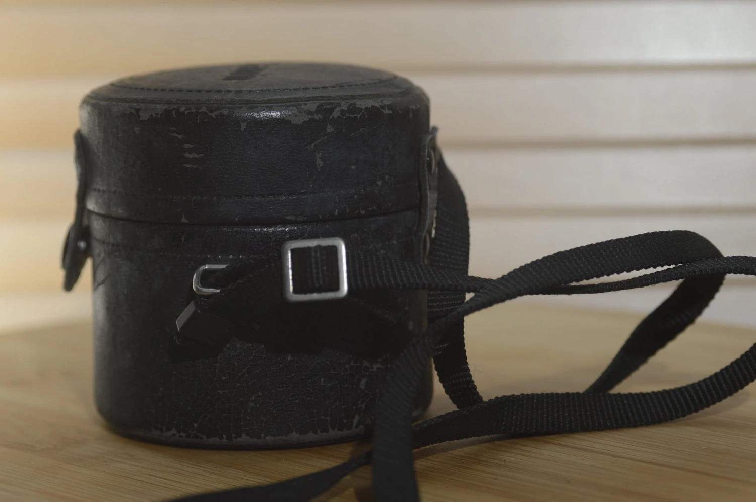 this lovely hard leather case is perfect for protecting your vintage lenses. Ideal for transporting your lens. Built to be durable, secure and easy to use. It has seen some wear and a touch of leather restorer will bring this back to it’s former glory.