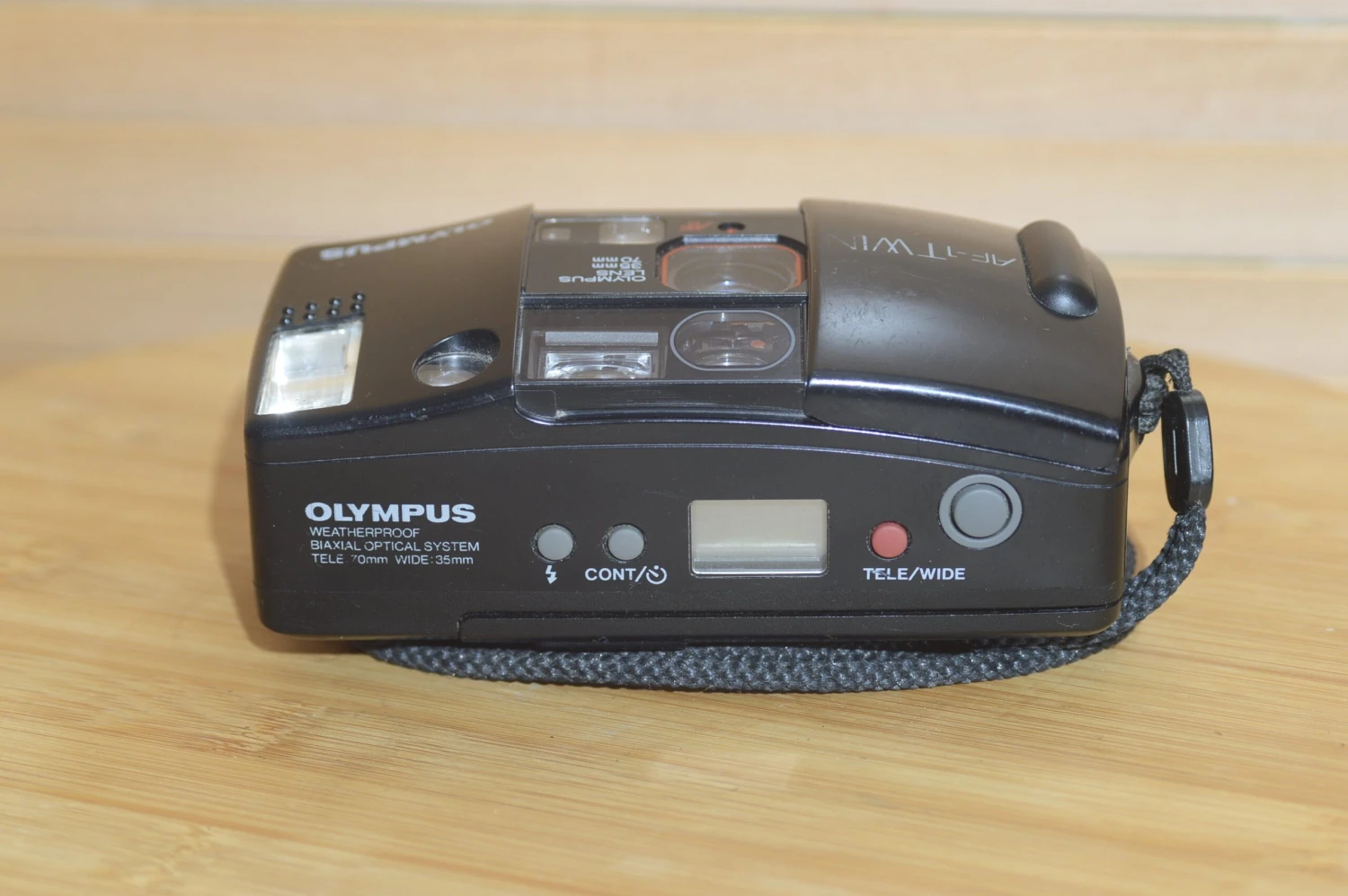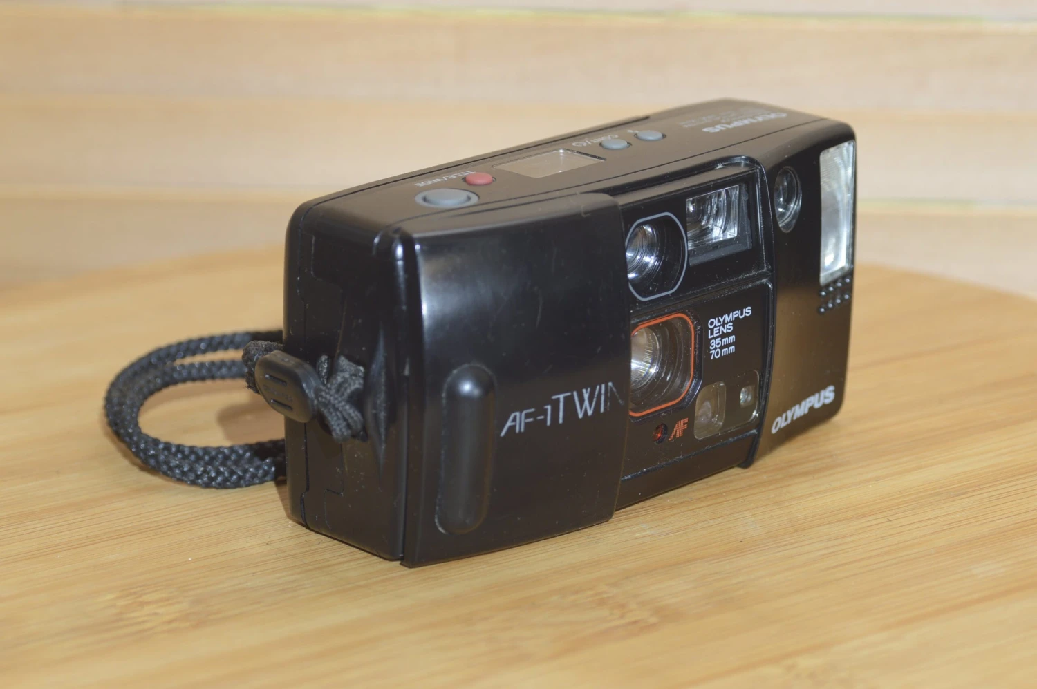 The Olympus AF-1 Twin (Infinity Twin in the US) of 1988 has a biaxial (two-lens) system so the user can switch between a 35mm wide-angle lens and a 70mm telephoto lens at the touch of a button. It also has the weatherproof design used on the other models in the Olympus AF series. The AF-1 Twin is the first model in the AF series with moulded plastic lenses; Olympus had to overcome moisture absorption (for a splash-proof camera) and other issues. A Quartzdate model was available.