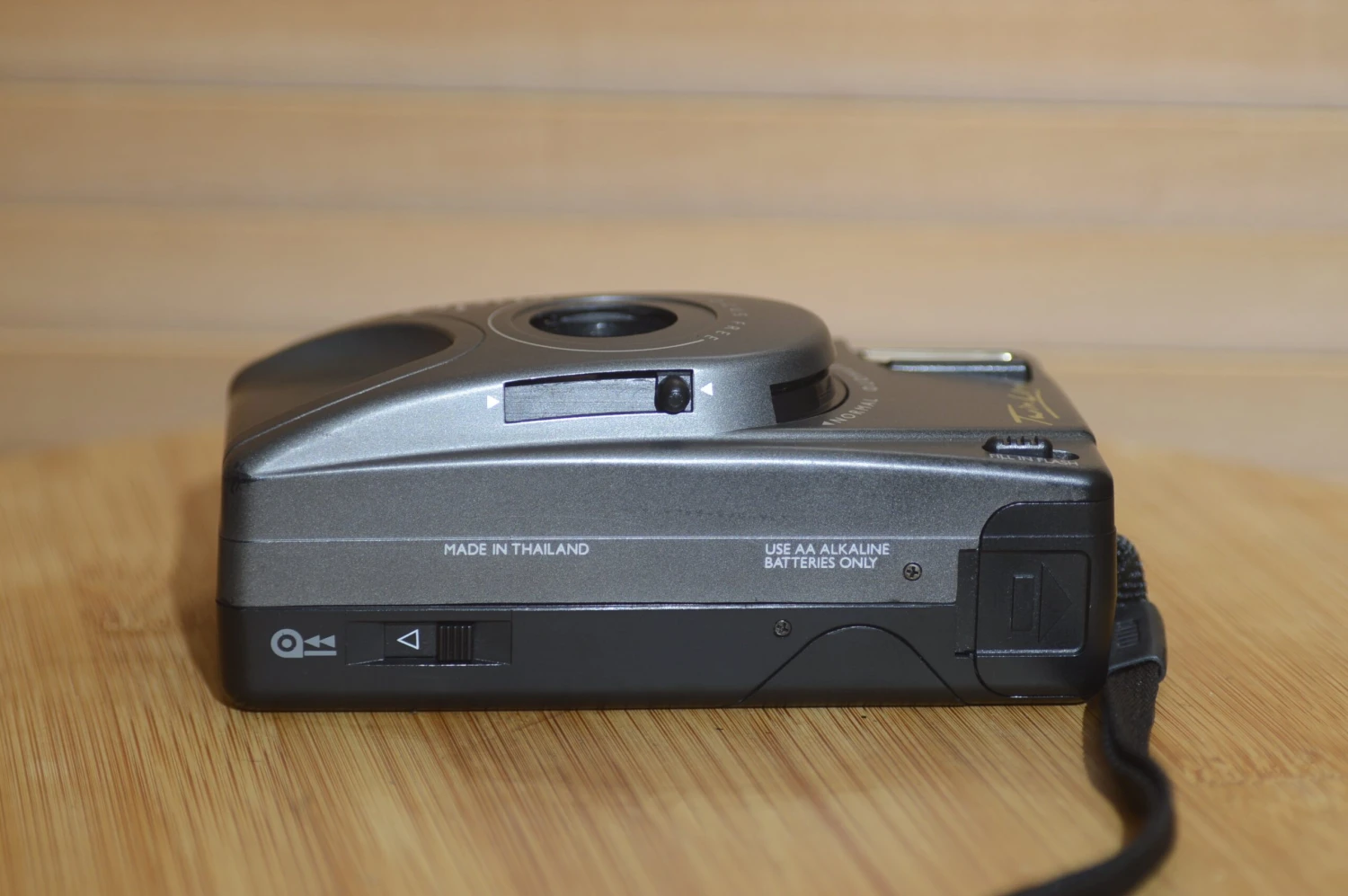The camera is compatible with DX encoded film, but with no encoded films it defaults to using ISO 100. It is powered by 2x AA batteries.