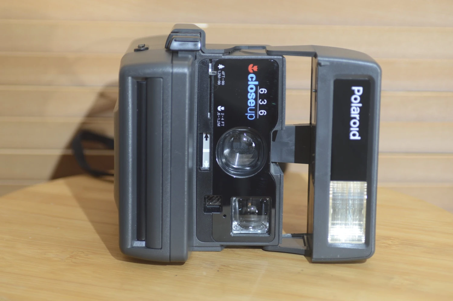 A 45-degree angle shot of a Polaroid camera, model 636 Close Up, also known as OneStep Close Up in some regions. This entry-level folding instant photo camera was mass-assembled in Russia in the 1990s by a Svetozor joint venture.